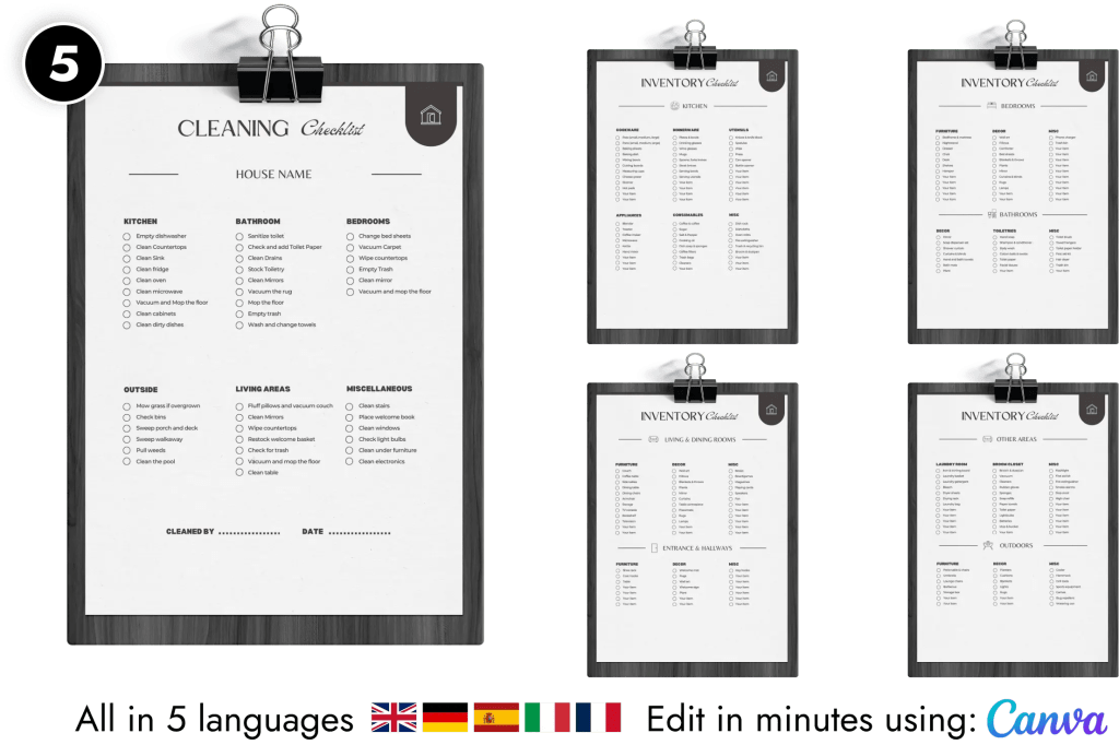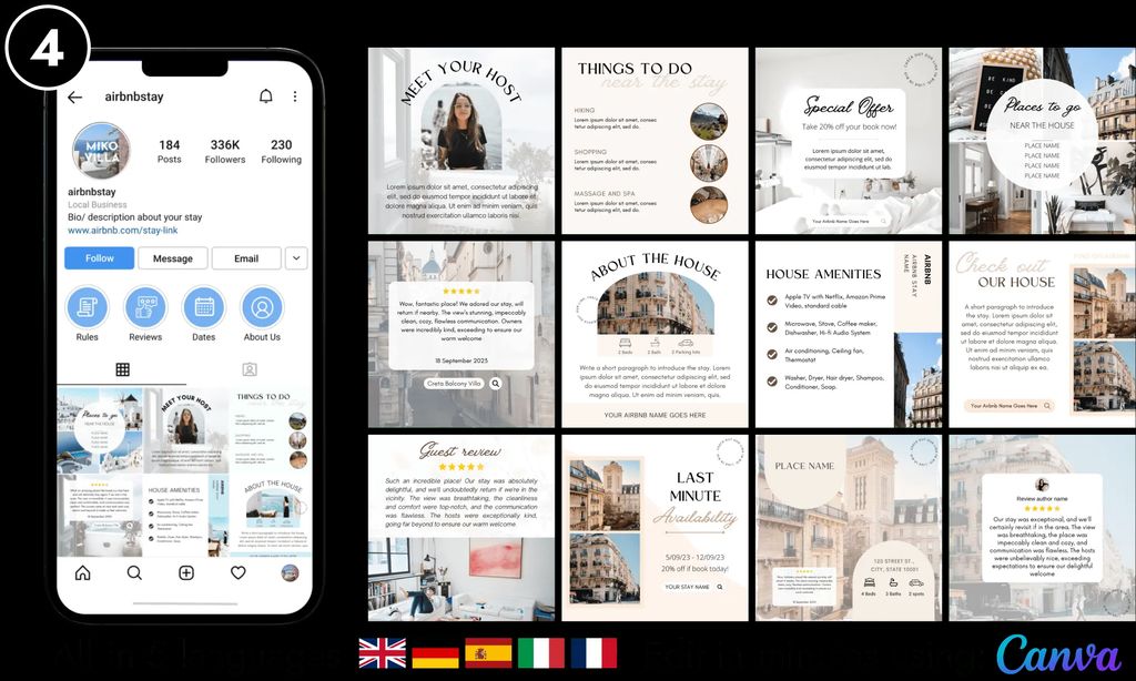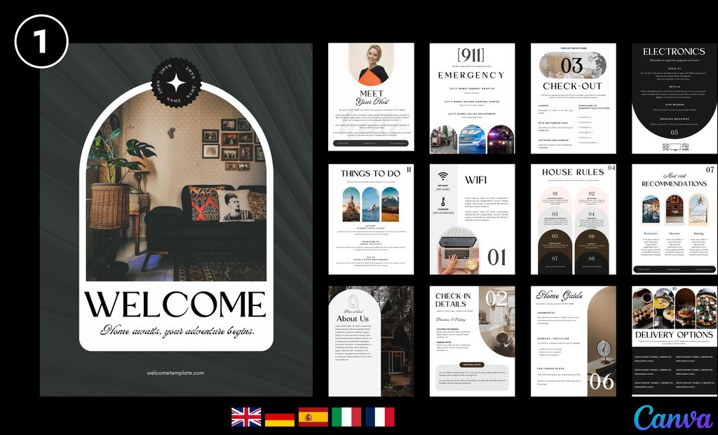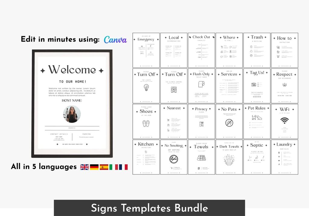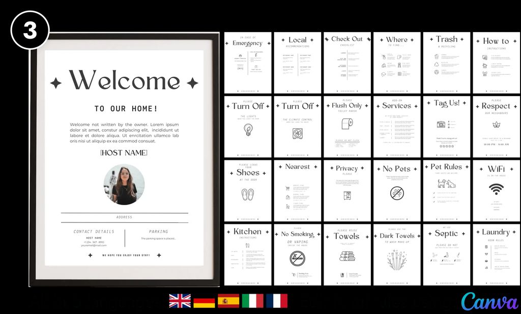 • 21-page editable welcome book template • Income & expense booking calendar spreadsheet • 25 printable wall signs • 32 Canva social media templates • Five printable checklists • Bonus ebook with 101 hosting secrets